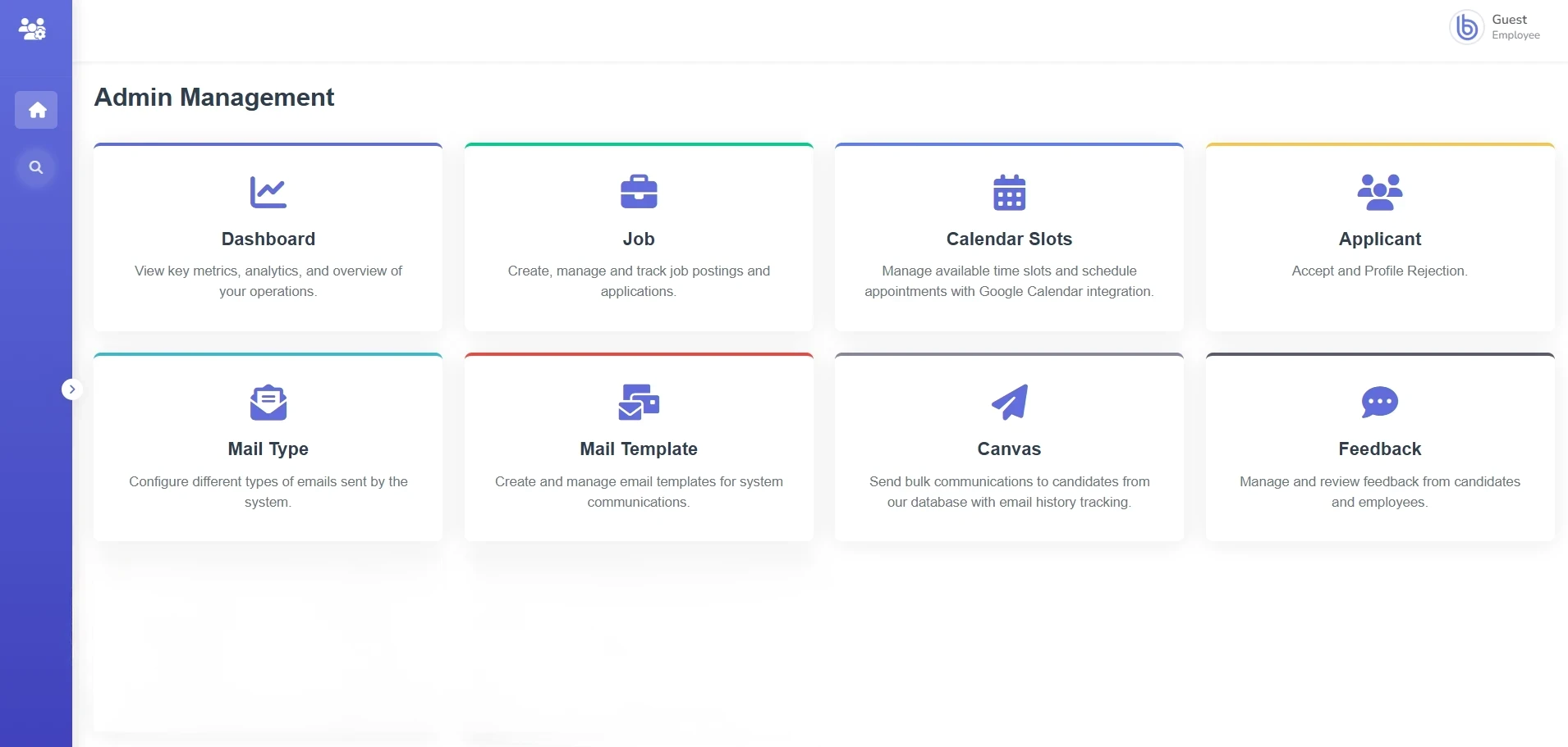 The OpenSlots Admin System provides full control for managing appointments, job postings, applicant records, and user interactions. Administrators can create, update, and monitor job listings, track application status, and oversee all scheduled appointments in real time. With centralized management features and efficient workflow tools, the system ensures smooth operations and enhances the overall recruitment and scheduling process.